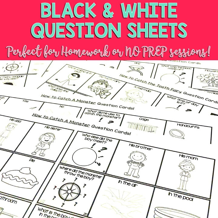 Black and white question cards are also included for this book. These are the same question cards that come in color in this pack. *Questions that are different are ones including a “color” answer choice. These can be used during sessions as a NO PREP ACTIVITY, for carryover, and/or be sent home as homework. Have your students color or use dot markers to choose their answers.