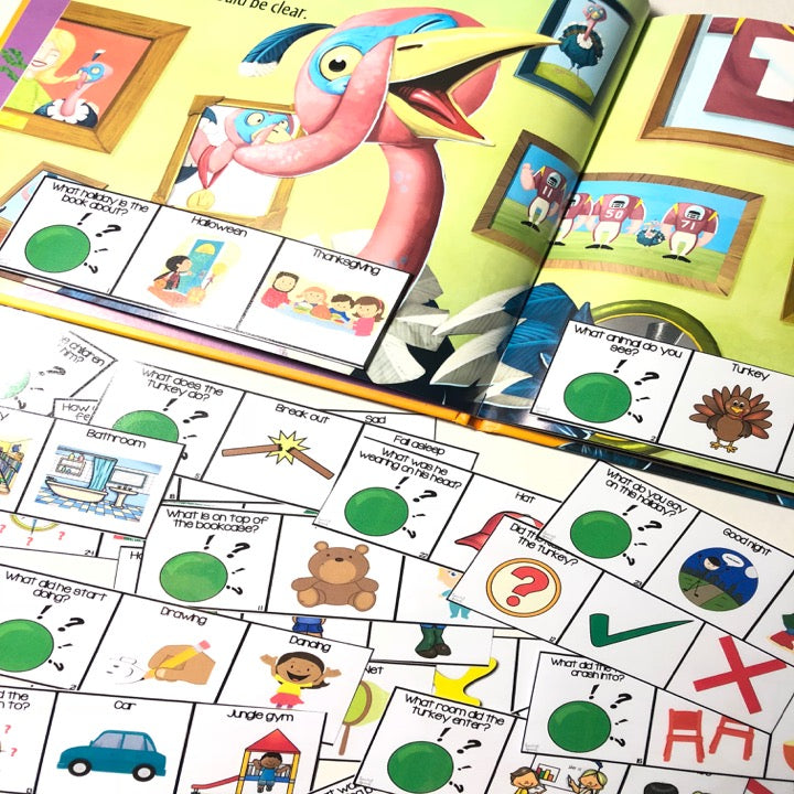 This pack includes 24 questions with two answer choices per question. All questions/answers are adapted to use with the book How to Catch a Turkey by Adam Wallace & Andy Elkerton. This book is NOT included with this pack but can be purchased on Amazon. You will need this book in order to the use the included adapted pieces. Click HERE to purchase using my Amazon Affiliate link.