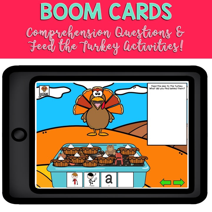 For the sensory bin activity, students can ”feed the pies to the turkey” to uncover visuals/interactive pieces from the book. The included sentence strip is perfect for working on expanding utterances!