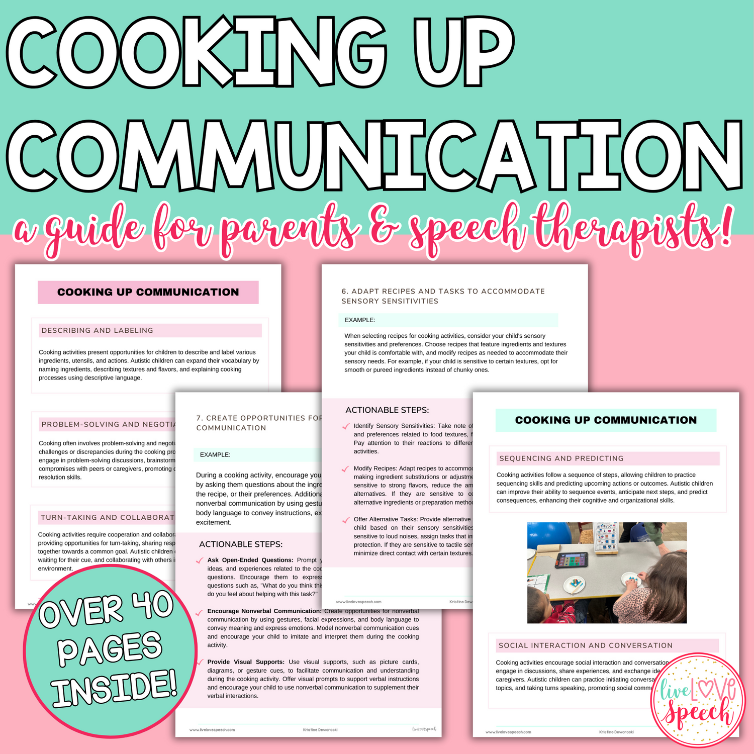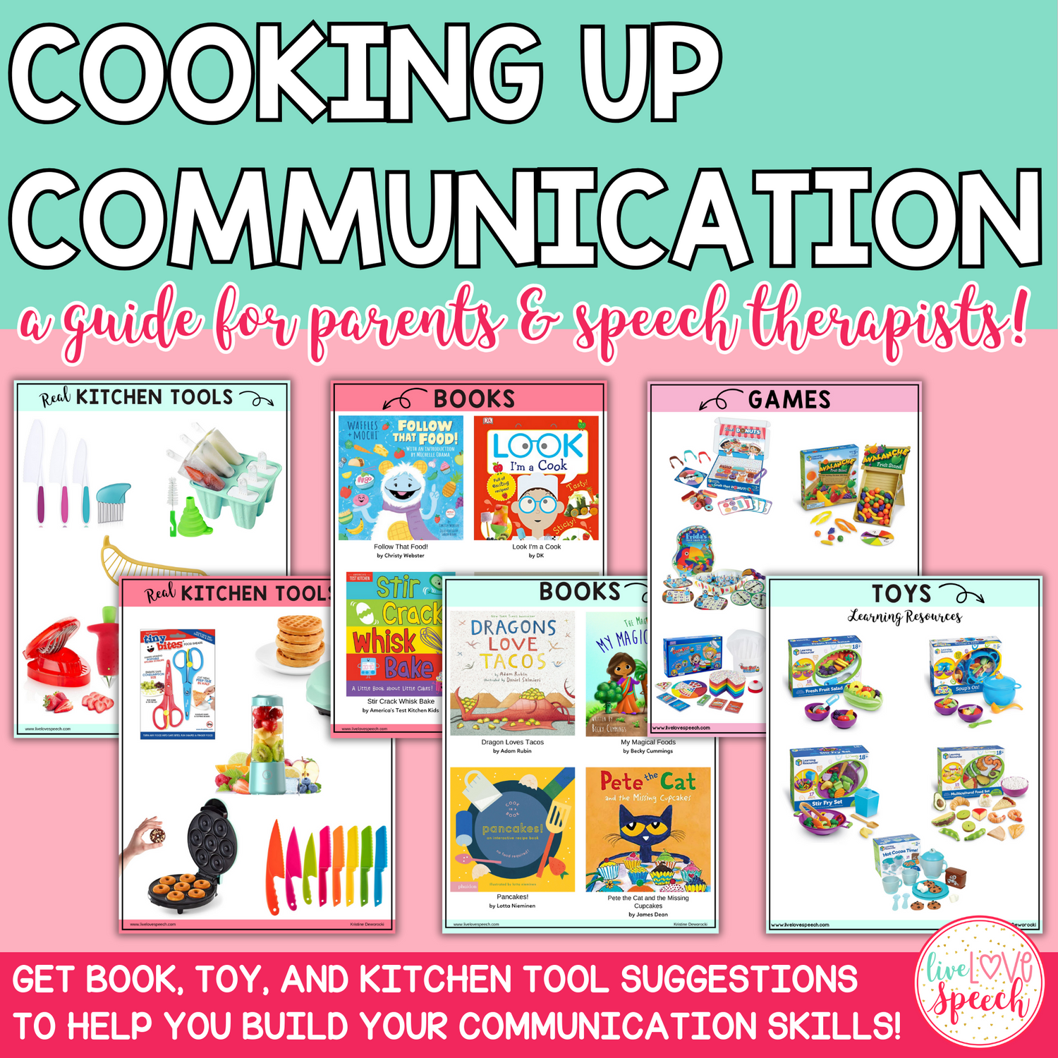 Inside this 40+ digital guide, you will find a step-by-step roadmap on how you can infuse cooking with communication skill building in a fun and engaging way. You will also find books, toys, games, and kitchen tools linked inside to make incorporating what you learn from the guide easy and seamless.