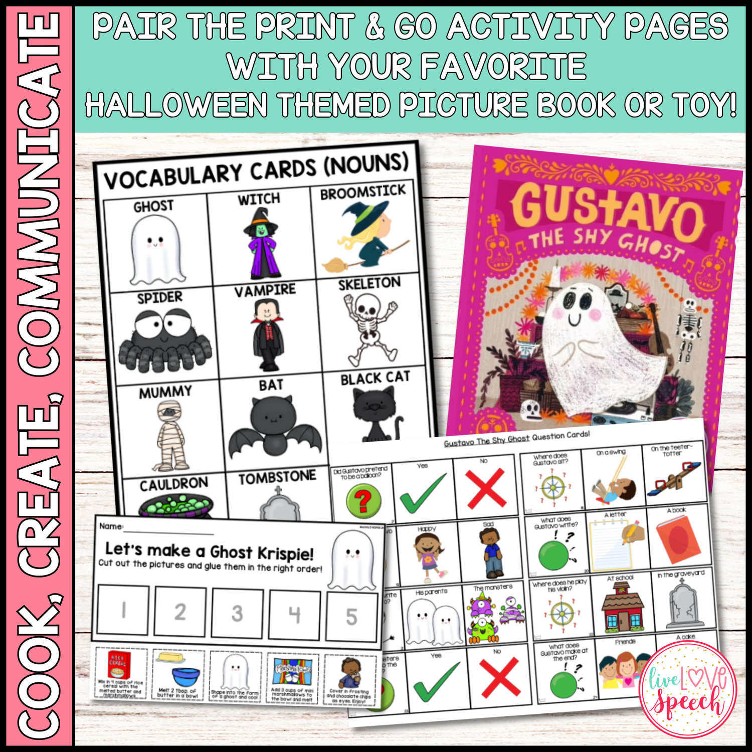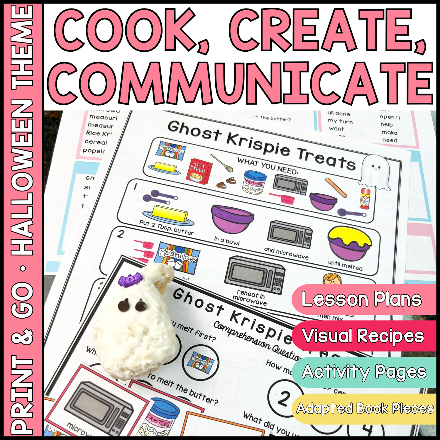 - Visual Recipe, Comprehension Questions & Vocabulary Cards to make “Ghost Krispie Treats”