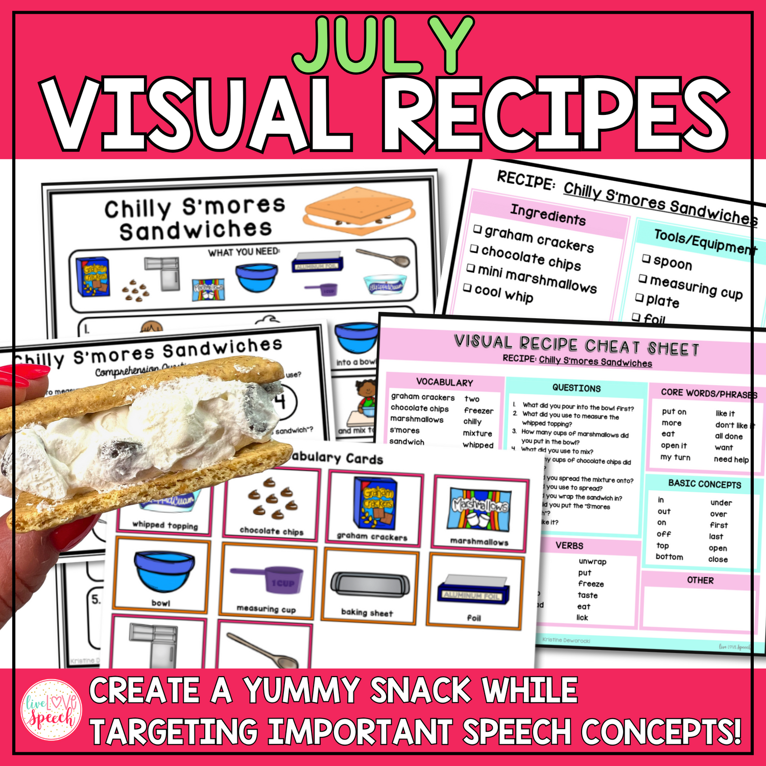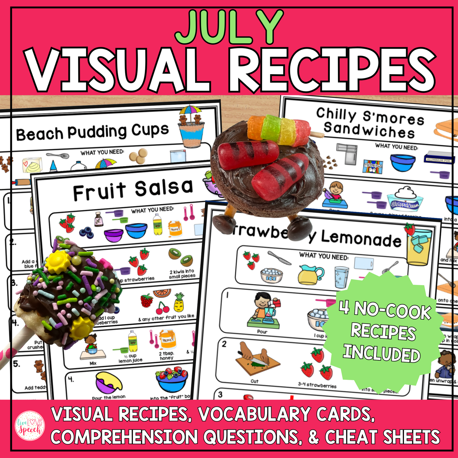 Looking for a fun way to incorporate cooking into your speech therapy sessions? My July Visual Recipes! Included inside are four, NO-COOK recipes that you can use alongside your favorite picture book, toy, or seasonal activity. Engage your students for your whole session by doing something they love to do — COOK!